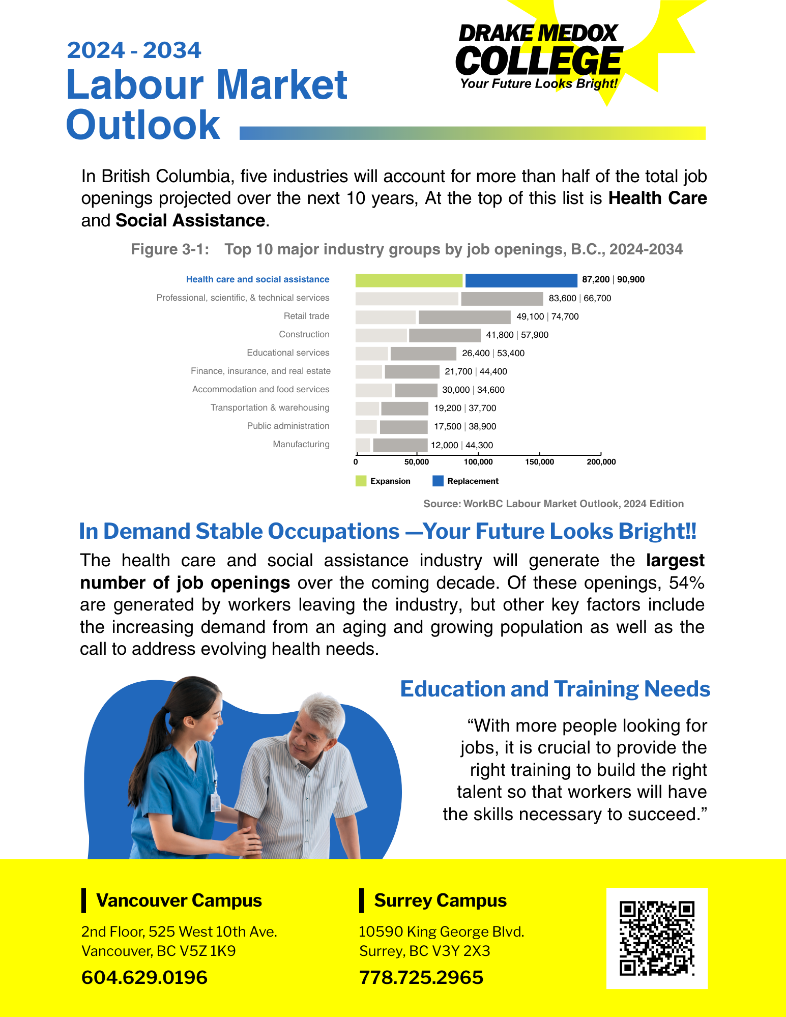 Healthcare and Social Services is currently the fastest growth industry group in BC, primarily because of our aging population. According to the WorkBC Labour Market they are forecasted to have the largest number of job openings through to 2034.